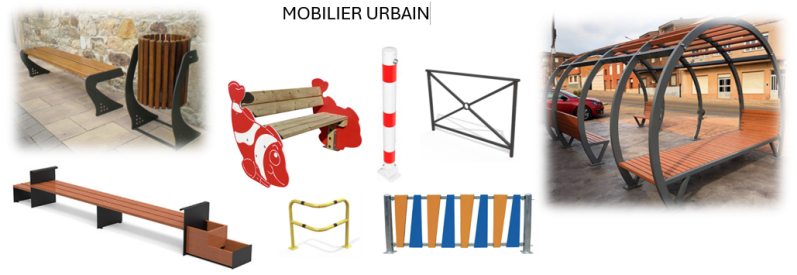 Mobilier urbain (Bancs, bornes , potelets, barrières, corbeilles, ... en bois, métal, composite, plastique , ...)